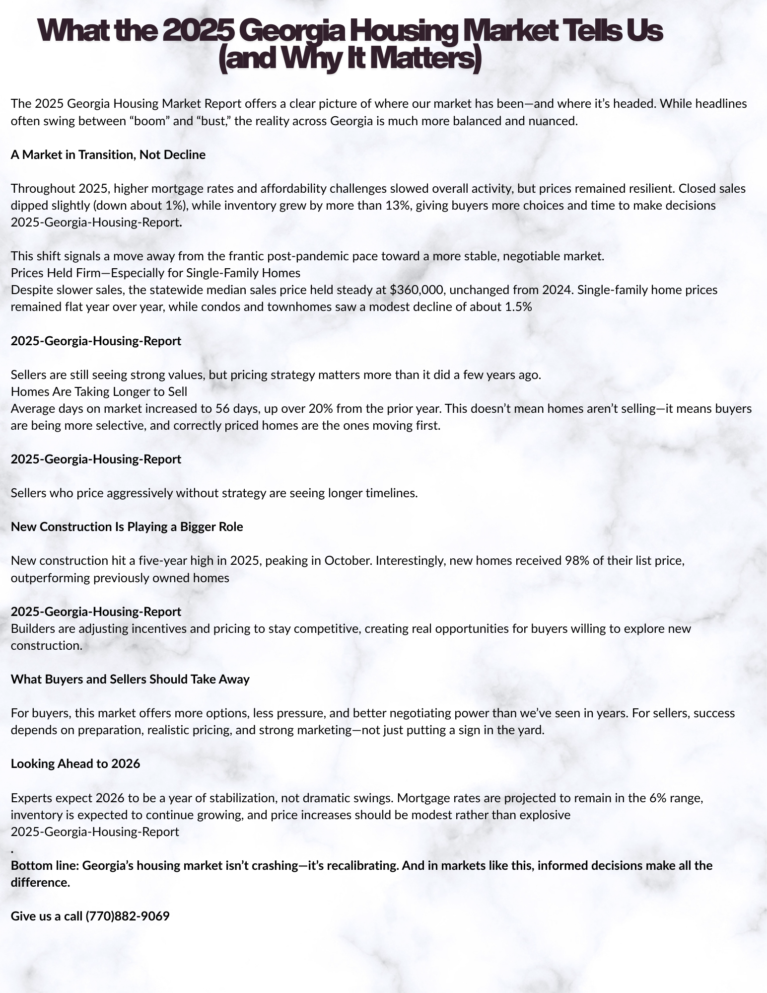 Prices in West Georgia have cooled slightly from pandemic highs but remain steady overall. Popular areas like Douglasville and Carrollton are still seeing moderate appreciation, while smaller towns offer more pricing flexibility. The market isn’t crashing—it’s correcting to a more balanced pace.